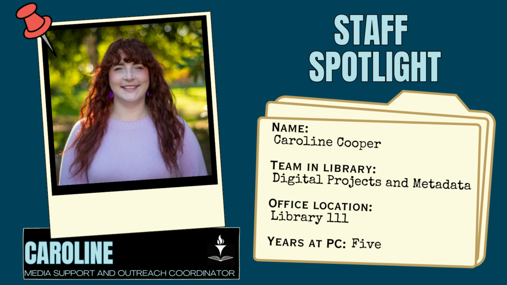 As the library Media Support and Outreach Coordinator, my day to day can be varied. If the Digital Projects & Metadata team is participating in class instruction, that is the focus of the day with preparation and post session feedback. Otherwise my days are spent meeting with other library staff, designing signage or social media content, helping with technology needs, and working digital projects.